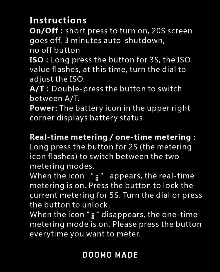 - Meter S: The Meter S is a light meter with OLED display screen, all parameters are displayed on the OLED screen, built-in lithium battery, Type-C charging. Compared with Meter D, Meter S has a smaller size, faster metering speed and simpler operation. Real-time metering is the biggest feature of meter S. It can meter light completely without manual operation, and the speed is very fast.